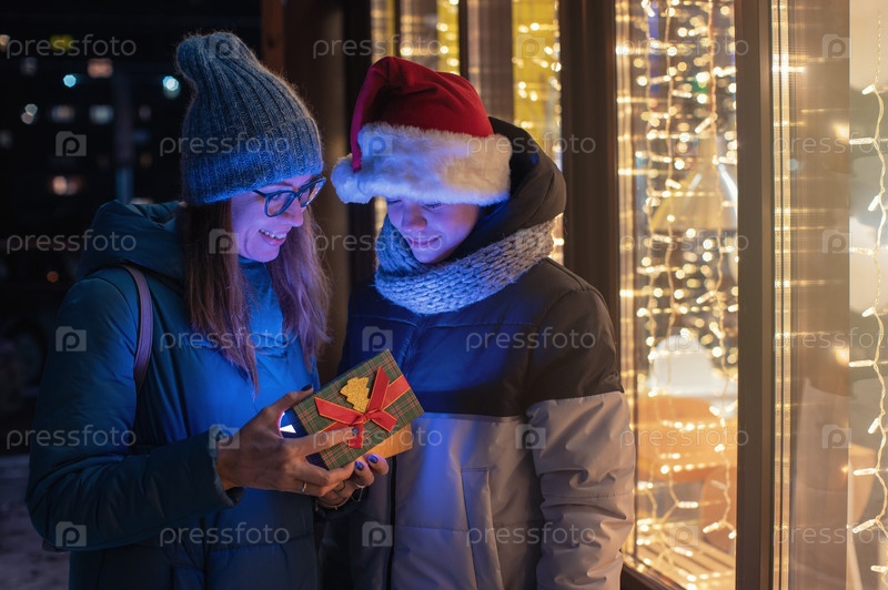Красивая женщина и ее сын в шапке Санты открывают подарочную коробку