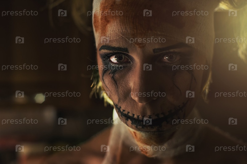 Ужасный портрет больной женщины с иллюстрацией COVID-19 на зрачках