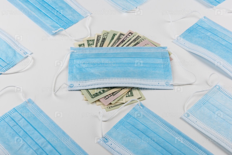 Продать - купить концепцию медицинской маски для лица. Защитные маски для лица и банкноты долларов США
