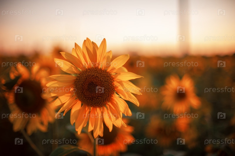 Подсолнух крупным планом на фермерском поле на закате летом