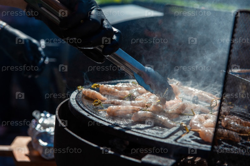 Профессиональный повар готовит креветки на гриле на открытом воздухе, концепция питания или кейтеринга