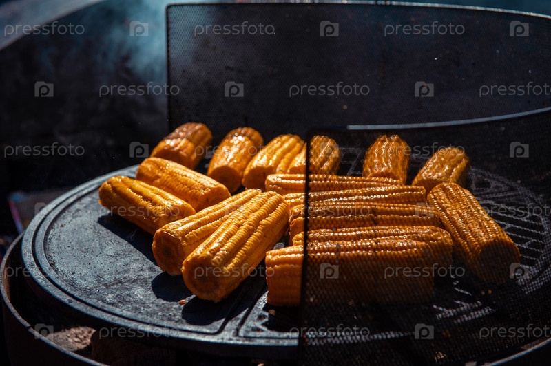 Профессиональный повар готовит кукурузу на гриле на открытом воздухе, концепция питания или кейтеринга