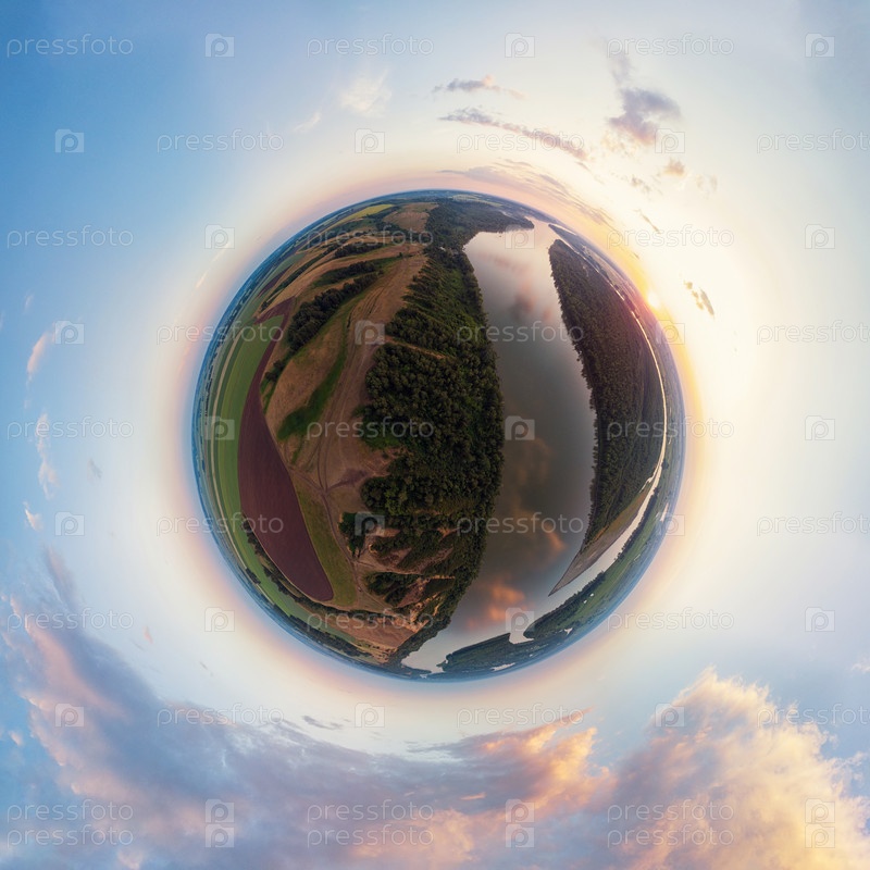 360 сферическая панорама сверху речного ландшафта в солнечный летний вечер. Вид сверху на сибирскую реку Обь с высоты в летний закат. Содержание виртуальной реальности