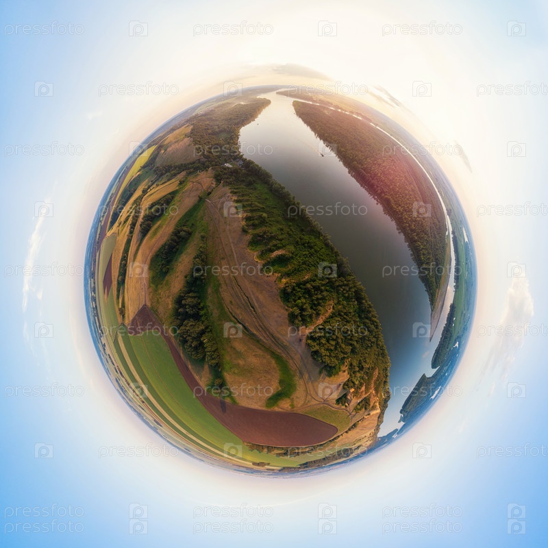 360 сферическая панорама сверху речного ландшафта в солнечный летний вечер. Вид сверху на сибирскую реку Обь с высоты в летний закат. Содержание виртуальной реальности