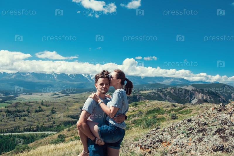 Влюбленная пара вместе на Алтайских горах, любуясь видом