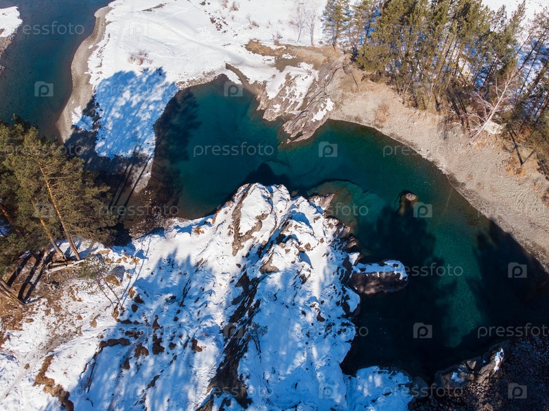 Вид с воздуха на зимние голубые озера в горах Алтая