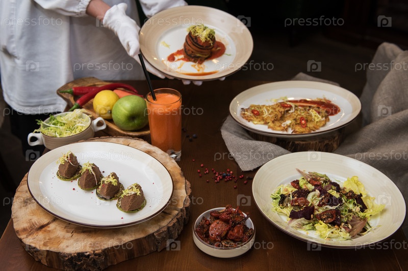 Официантка приносит еду. Салат из свеклы с вялеными томатами и капустой, картофельные веганские блины, вяленые томаты, паштет из красной фасоли, запеченные овощи слоями, фрукты и морковный сок