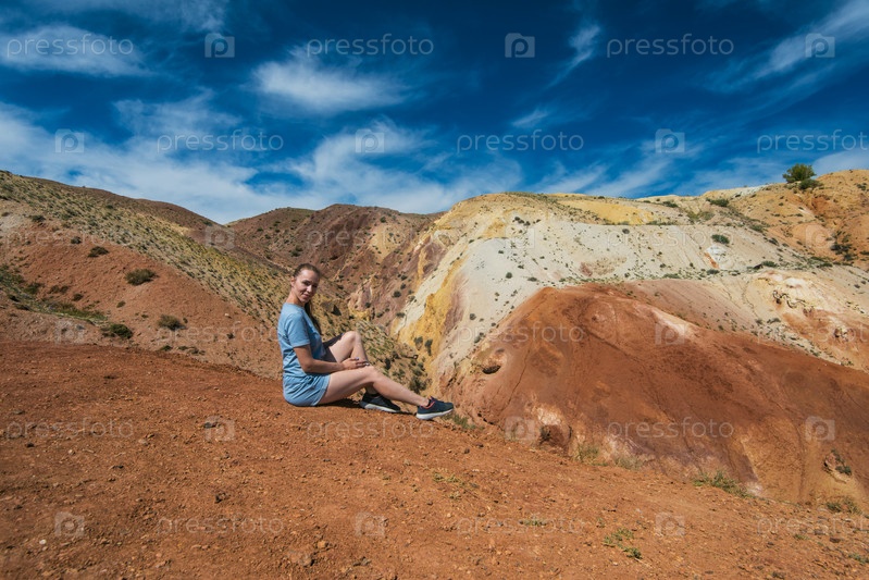 Женщина в долине Марса, пейзажи в горах Алтая, Кызыл-Чин, Сибирь, Россия