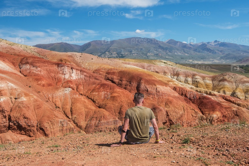 Отдыхающий мужчина в долине Марса, пейзажи Алтайских гор, Кызыл-Чин, Сибирь, Россия