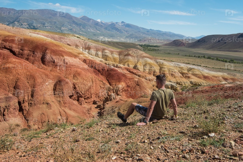 Отдыхающий мужчина в долине Марса, пейзажи Алтайских гор, Кызыл-Чин, Сибирь, Россия