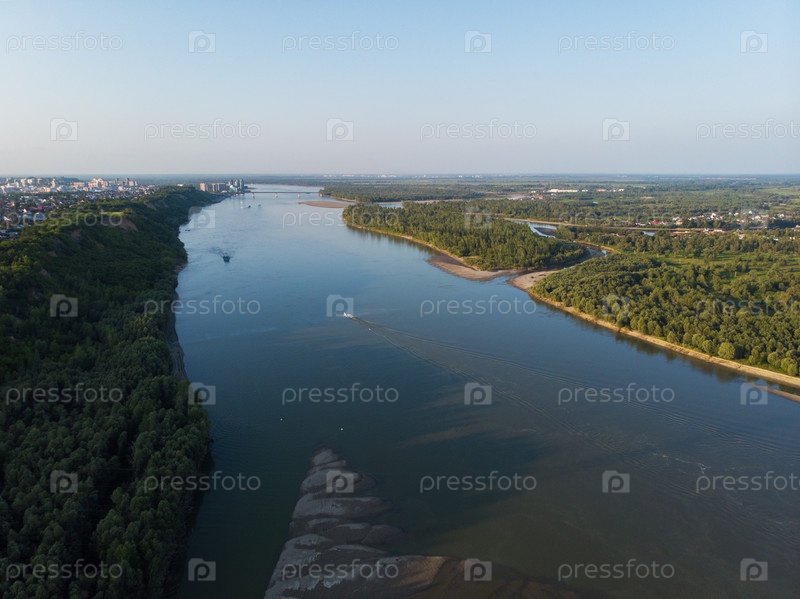 Вид с воздуха на большую сибирскую реку Обь и корабль, летний день, снимок с дрона