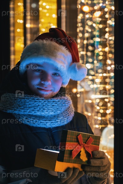 Мальчик в шапке Санты с коробкой подарков возле освещенной витрины магазина. Рождественские подарки, праздники или покупки на Новый год или Рождество