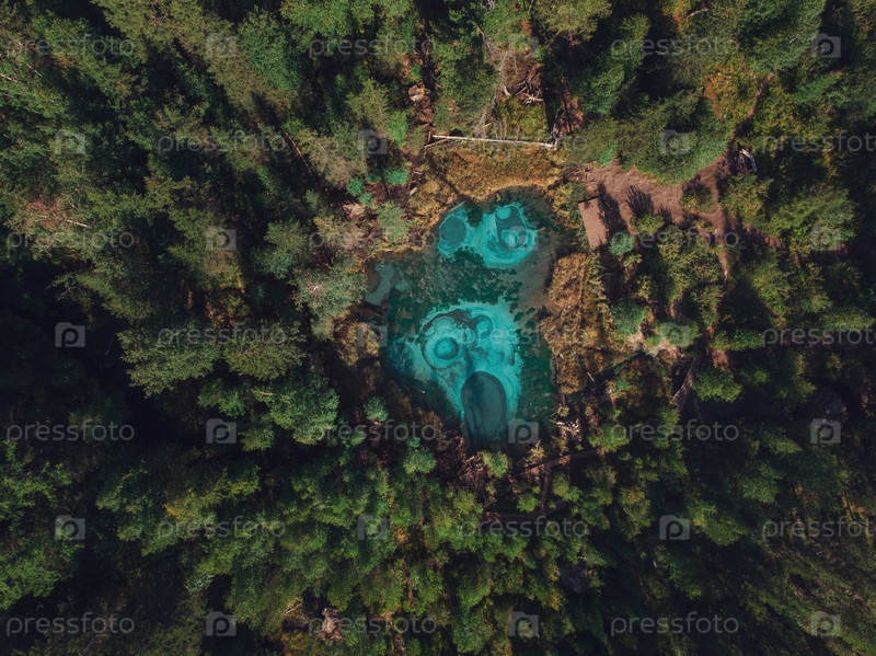 Красивое Гейзерное (голубое, серебристое) озеро с термальными источниками, которые периодически выбрасывают из земли голубую глину и ил. Вид с воздуха с дрона. Акташ, Алтайские горы, Россия