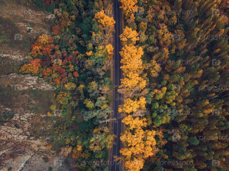 Вид с воздуха на дорогу в красивом осеннем лесу Алтая. Красивый пейзаж с пустой сельской дорогой, золотая осень на Алтае: деревья с красными, желтыми и оранжевыми листьями