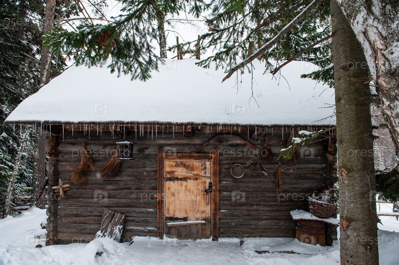 Старинный деревянный амбар в зимнем лесу. Ретро-здание начала 19 века