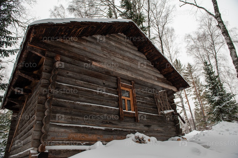 Старинный деревянный амбар в зимнем лесу. Ретро-здание начала 19 века