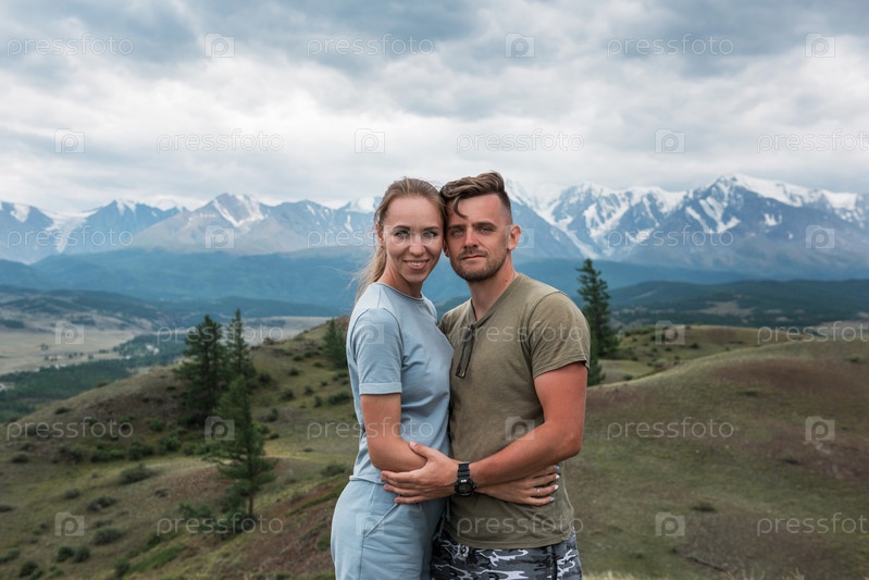 Романтическая пара в горах, в горах Алтая. Счастливые мужчина и женщина обнимаются на фоне горного ледника, улыбаются и смотрят в камеру