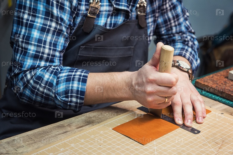 Мужчина работает с кожаным текстилем в мастерской