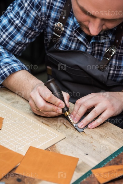 Мужчина работает с кожаным текстилем в мастерской