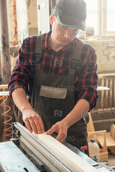 Плотник строгал деревянный брусок с помощью электрической машины