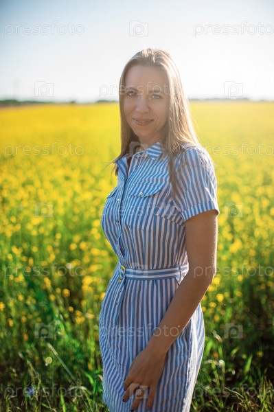 Красивая женщина в поле с желтыми цветами на летнем закате