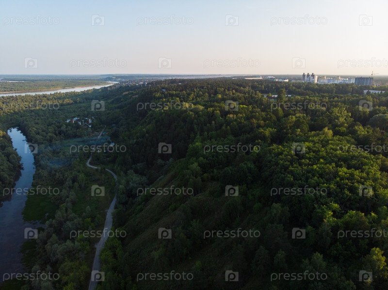 Вид с воздуха на большую сибирскую реку Обь в прекрасный летний день, снято с дрона