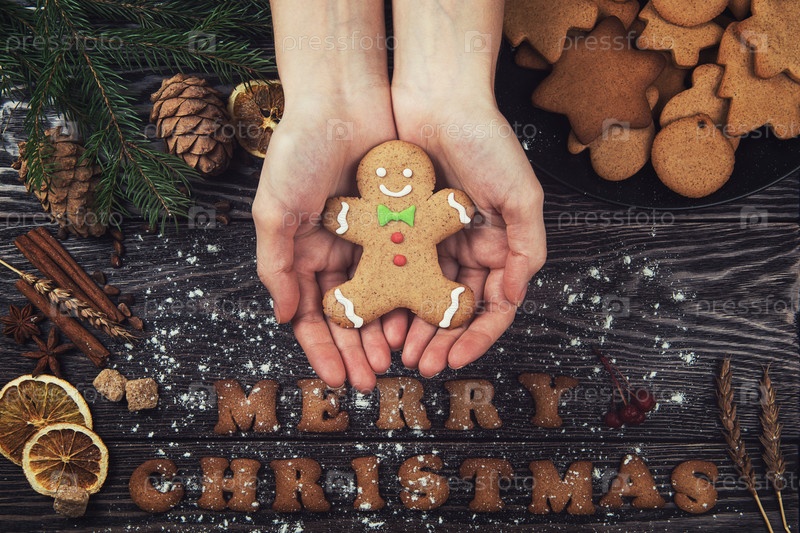 Вид сверху на женские руки, держащие пряничное печенье на деревянном столе с шишками. Концепция новогодних праздников и Рождества