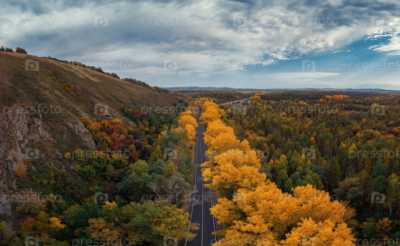 Вид с воздуха на дорогу в красивом осеннем лесу Алтая. Красивый пейзаж с пустой сельской дорогой, золотая осень на Алтае: деревья с красными, желтыми и оранжевыми листьями