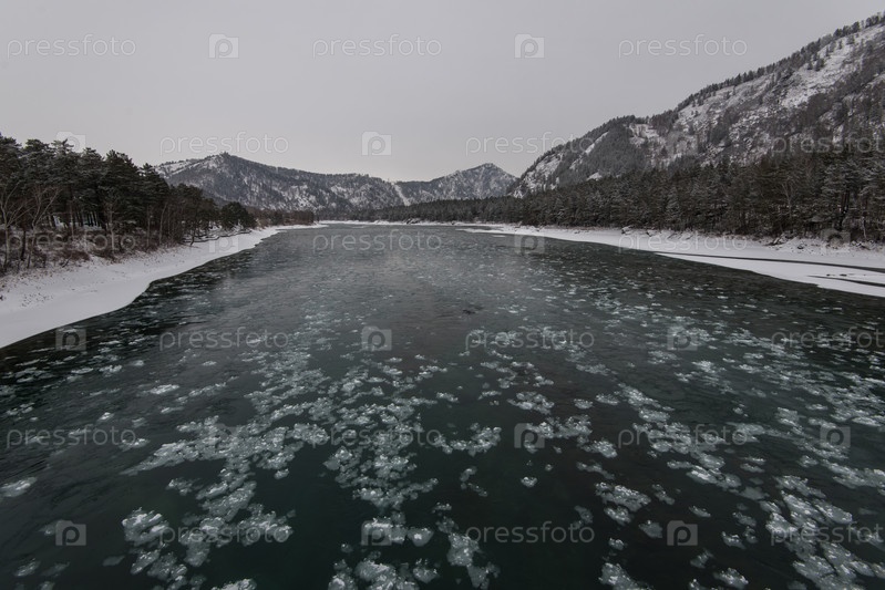 Пейзаж с рекой и горами, река Катунь в горах Алтая