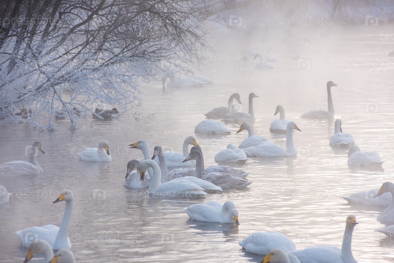 Красивые белые лебеди-кликуны плавают в незамерзающем зимнем озере. Место зимовки лебедей, Алтай, Сибирь, Россия