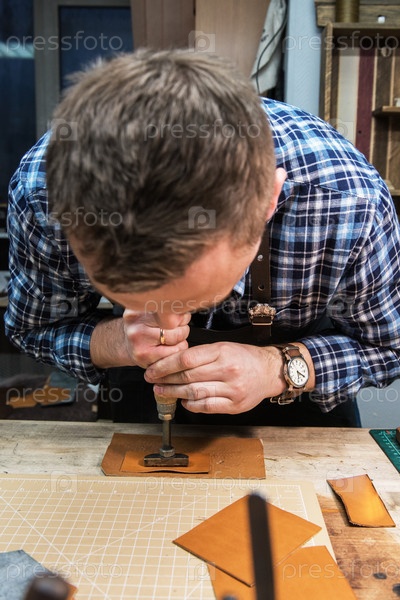 Мужчина делает штамп на кожаной ткани в мастерской