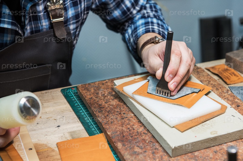 Мужчина делает кожаный кошелек в мастерской. Концепция ручного ремесленного производства кожаных изделий