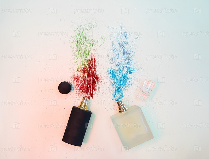Плоская композиция с двумя флаконами духов с блестками на бумажном фоне