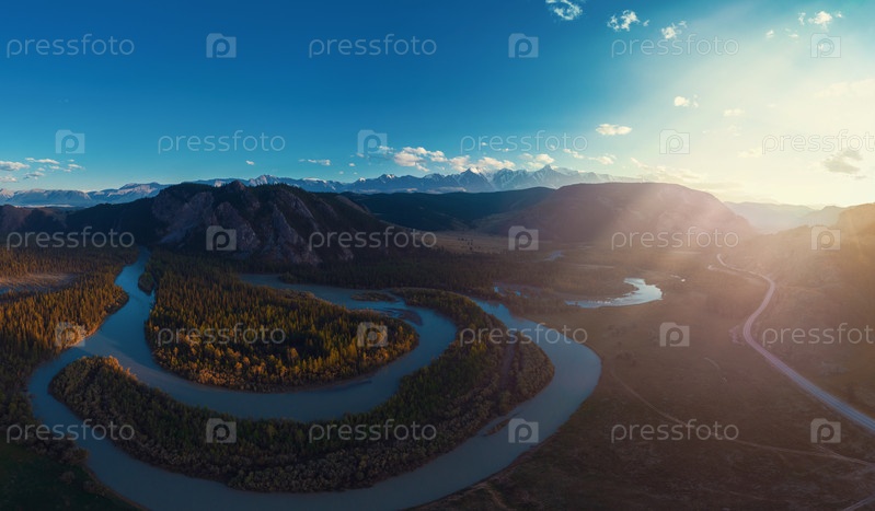 Курайская степь и река Чуя на фоне гор Северо-Чуйского хребта. Алтайские горы, Россия. Панорамный снимок с беспилотника