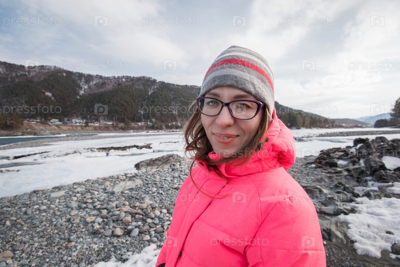 Счастливая женщина отдыхает на вершине горы в прекрасный солнечный весенний день, в горах Алтая. Концепция путешествия и отпуска