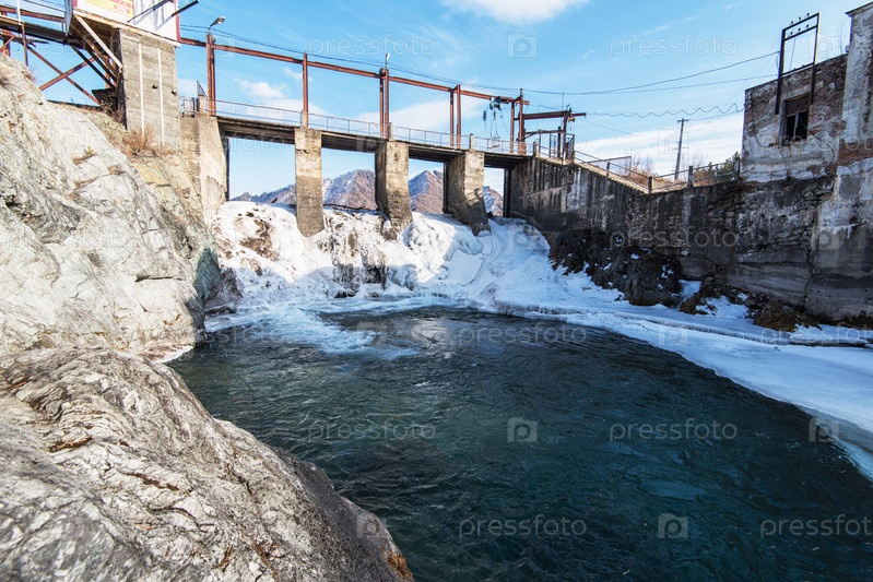 Старая гидроэлектростанция в Чемале, Алтай, Сибирь, Россия. Зимний солнечный день. Популярное туристическое место