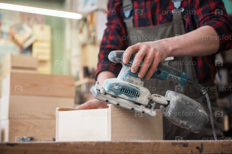 Рабочий шлифует деревянную коробку углового шлифовального станка