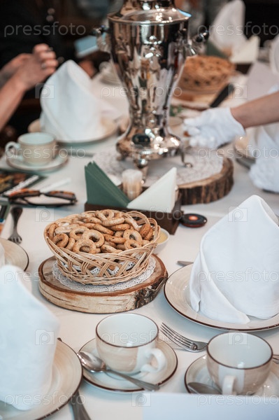Традиционная русская выпечка: пироги и крендели, самовар, мед, варенье на сервированном столе