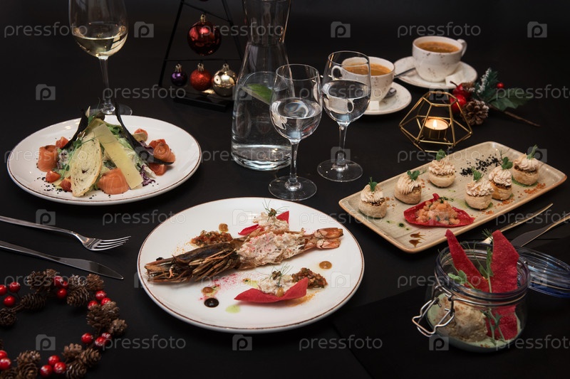 Вкусные блюда ресторана: вареные и фаршированные раки, салат, закуски и мороженое из раков