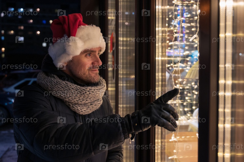 Мужчина в шапке Санты смотрит и мечтает в освещенную витрину магазина
