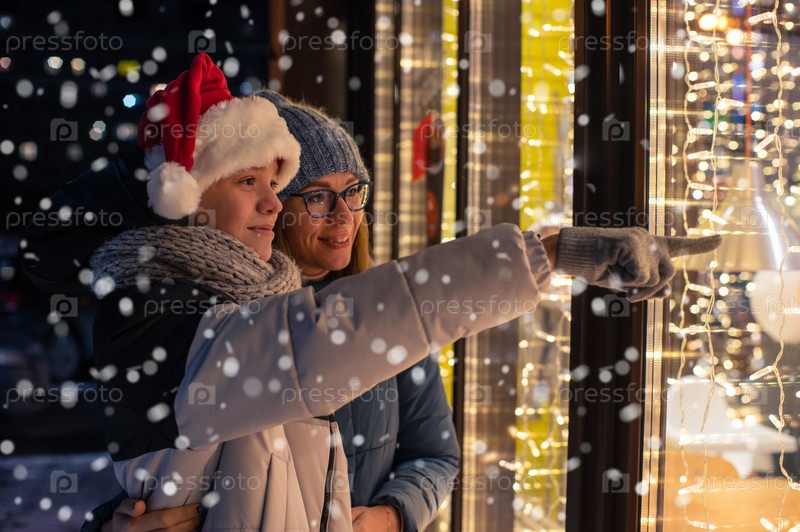 Красотка и ее сын в шапке Санты смотрят и мечтают в освещенной витрине магазина. Рождественские подарки, праздники или покупки на Новый год или Рождество концепции