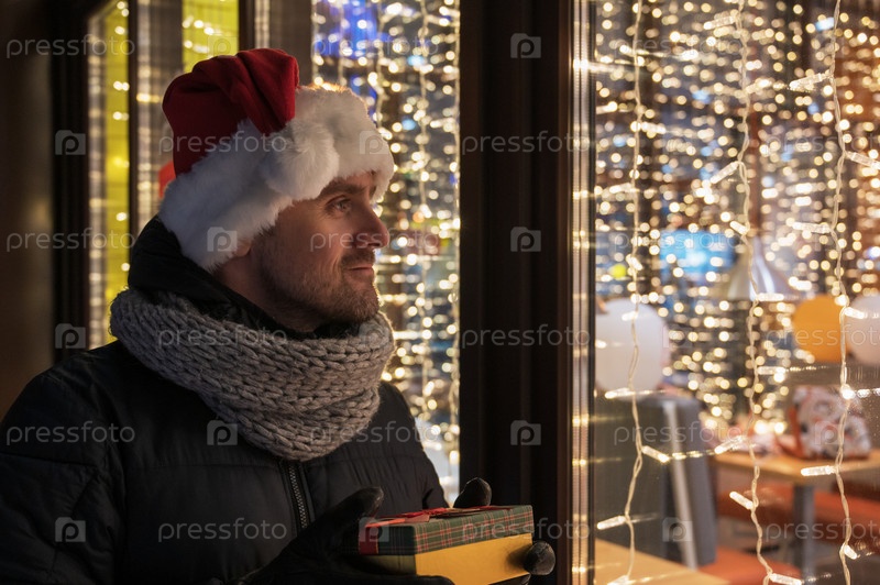 Мужчина в шапке Санты смотрит и мечтает в освещенной витрине магазина. Концепция продаж на рождественские праздники