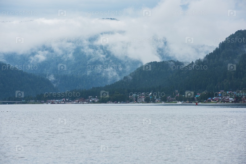 Телецкое озеро в горах Алтая, Сибирь, Россия. Туманное летнее утро