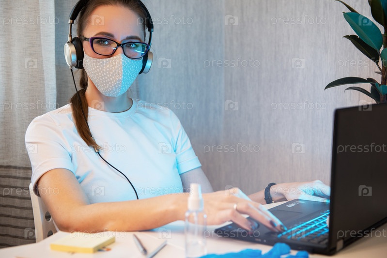 Женщина-врач работает в защитной маске и распыляет дезинфицирующее средство на рабочем месте