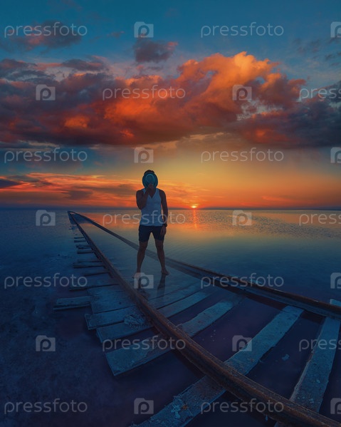 Мужчина на прекрасном закате на соленом озере в Алтае, Сибирь, Россия