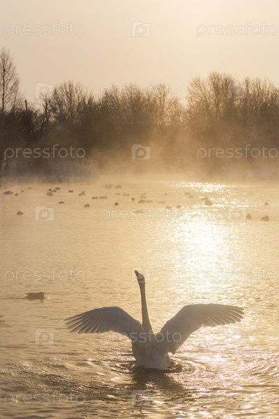 Красивый белый лебедь-кликун плавает в незамерзающем зимнем озере на закате. Место зимовки лебедей, Алтай, Сибирь, Россия