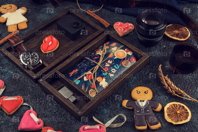 Деревянная фотокоробка с фотографией на День святого Валентина или День свадьбы. Украшена пряниками. Романтическая или любовная концепция. Пряники на День святого Валентина на темном бетонном фоне