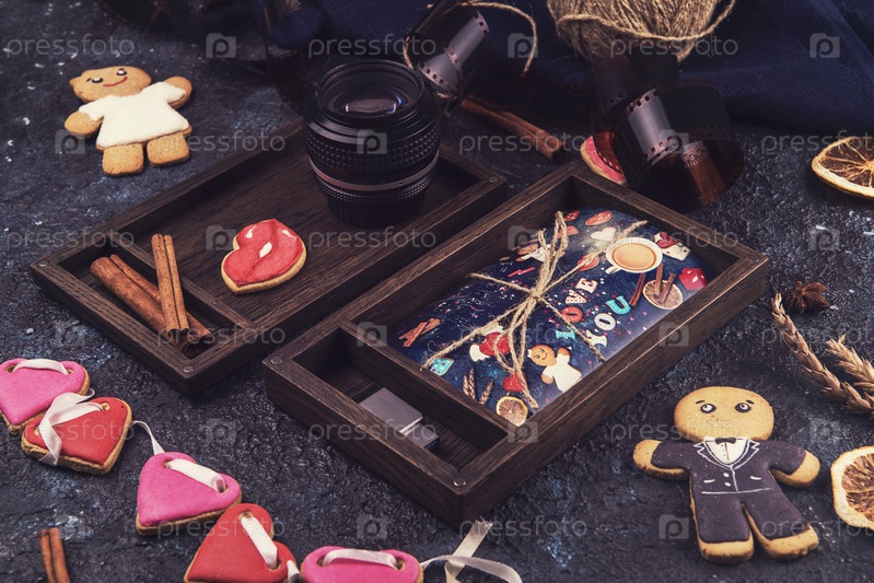 Деревянная фотокоробка с фотографией на День святого Валентина или День свадьбы. Украшена пряниками. Романтическая или любовная концепция. Пряники на День святого Валентина на темном бетонном фоне