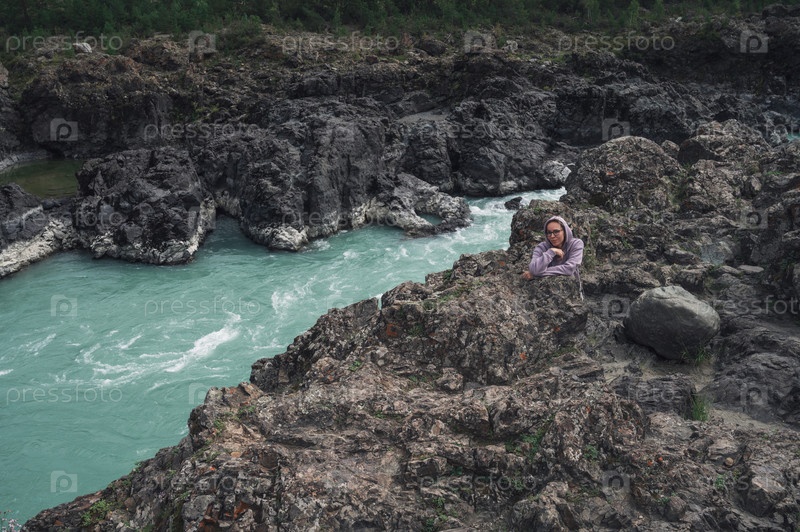 Женщина у реки Катунь в летний день. Поездка в Горный Алтай в Республике Алтай