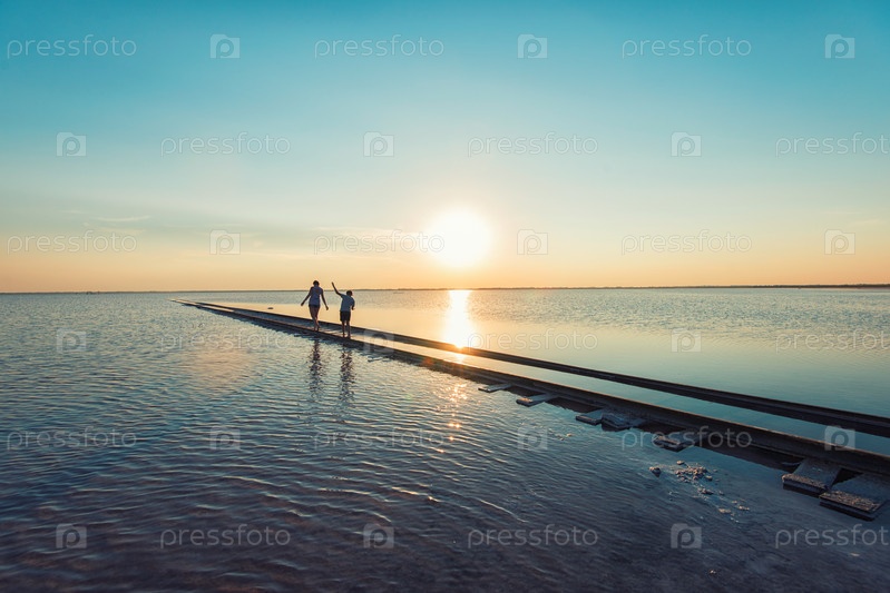 Мать и ее сын идут по железной дороге в соленое озеро. Красота заката на соленое озеро в Алтай, Сибирь, Россия